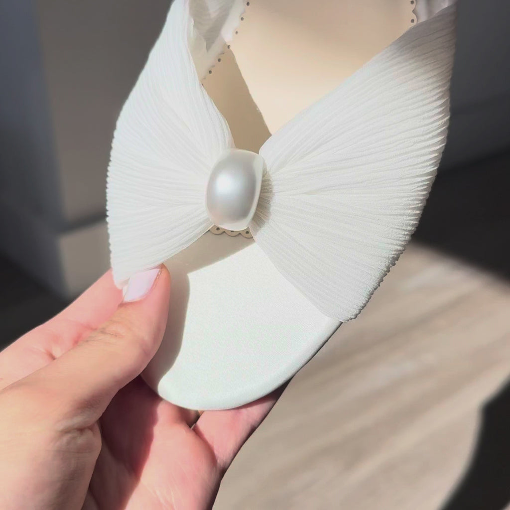 Demi brings runway glamour to the aisle with hand-pleated ruched tulle, a sculptural pearl accent, and slim adjustable ankle straps that elongate the leg. At 3.75 inches, these stiletto bridal sandals pair elevated style with cloud-soft cushioning for chic, comfortable celebration.arty.